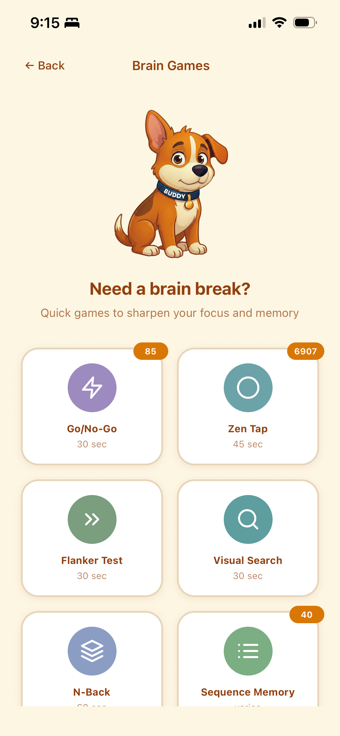 Buddy's brain games aren't for entertainment. They're cognitive activation ramps designed to warm up attention, support working memory, reduce impulsivity, and help you shift from fog → readiness. A few minutes is often enough to make starting possible.